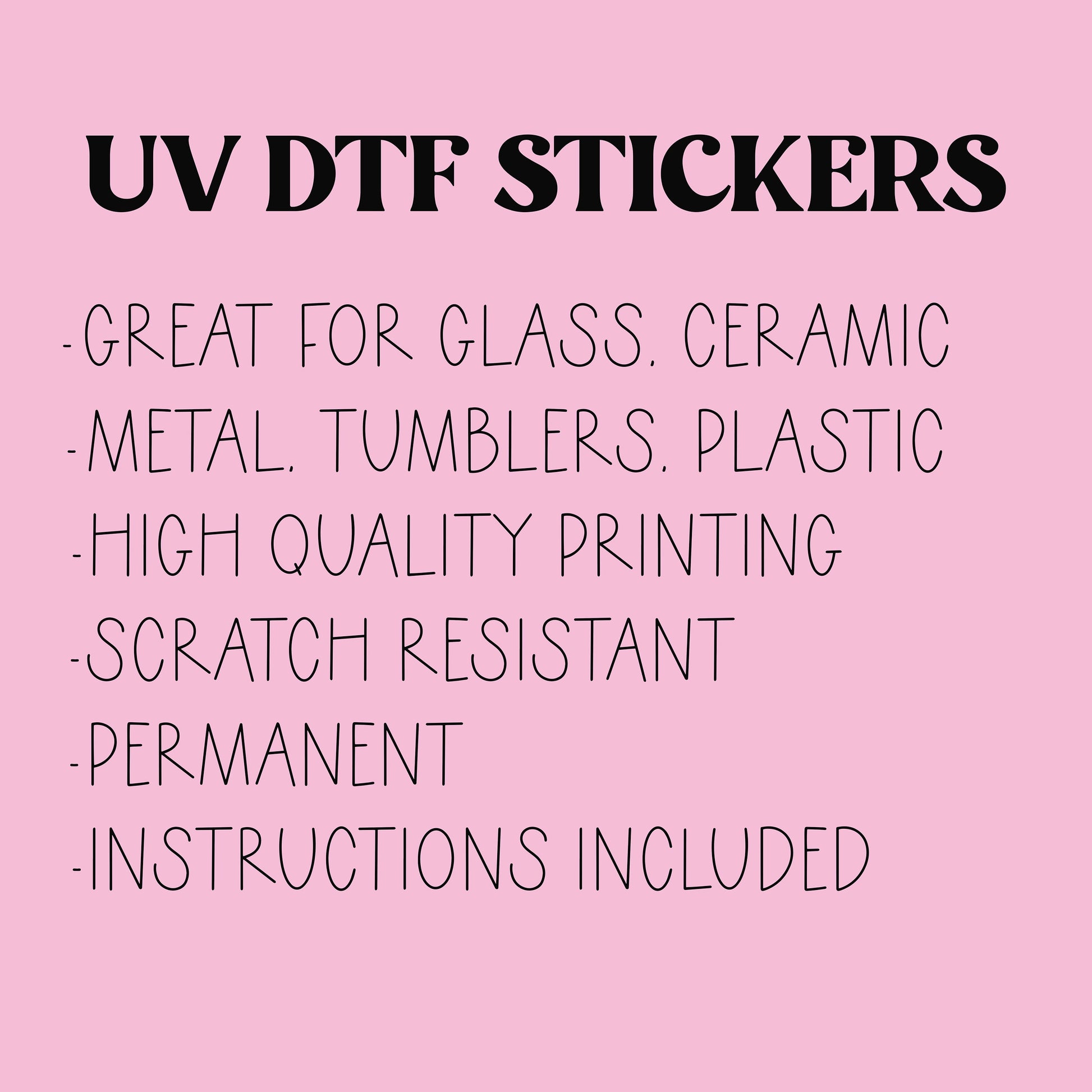 Create your own custom designs with a UV DTF gang sheet, perfect for cup wraps, stickers, logos, and more! These transfers are ready to apply—no heat press required. Just cut, peel, apply, and stick for a professional, long-lasting finish.