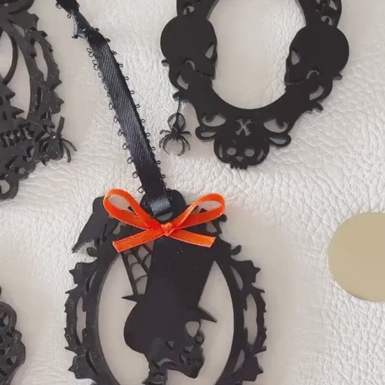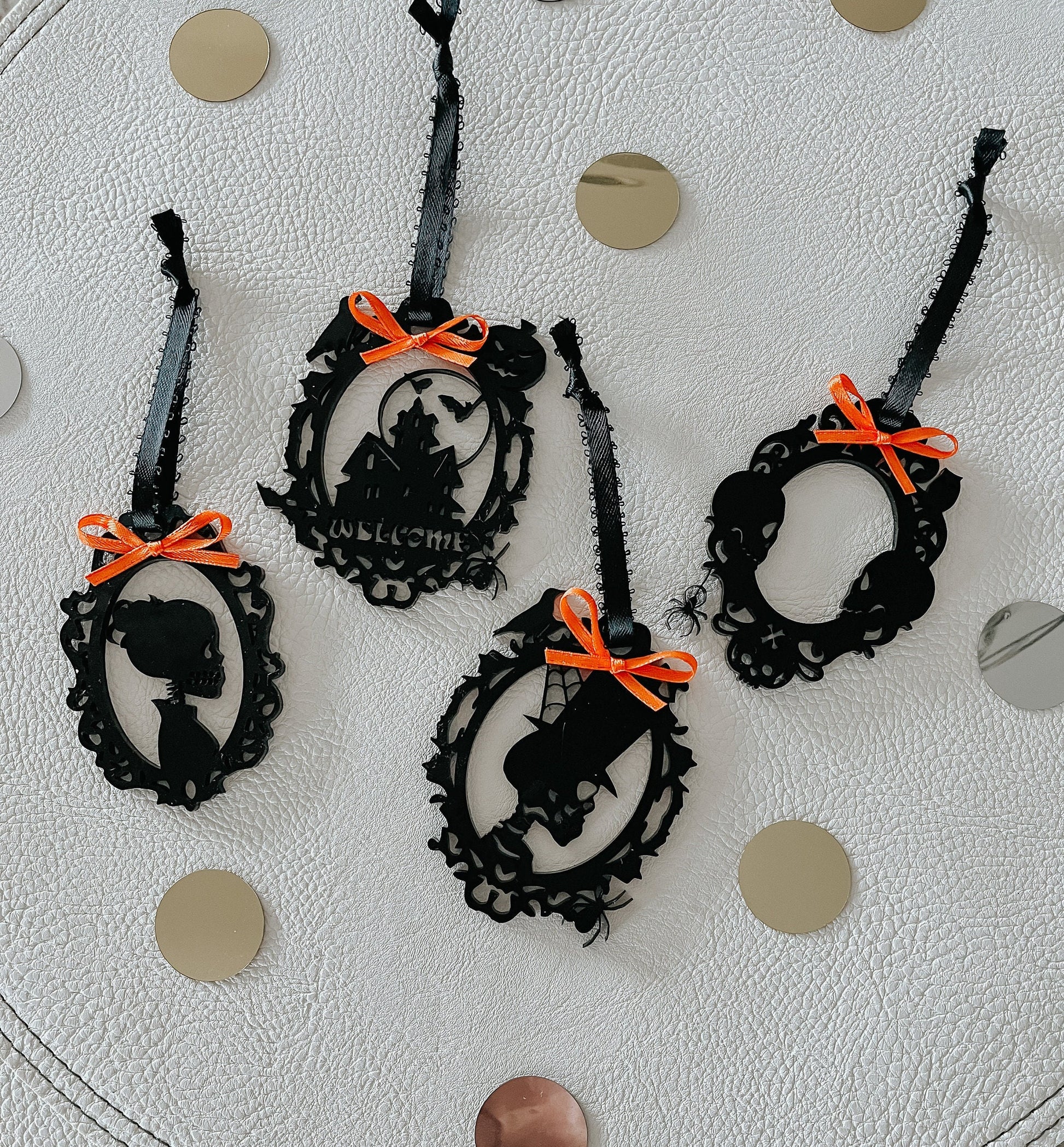 Choose a set of 4 or select your favorite individual ornament to customize your spooky display. Each piece is laser cut from durable black acrylic and comes with a black ribbon for easy hanging.