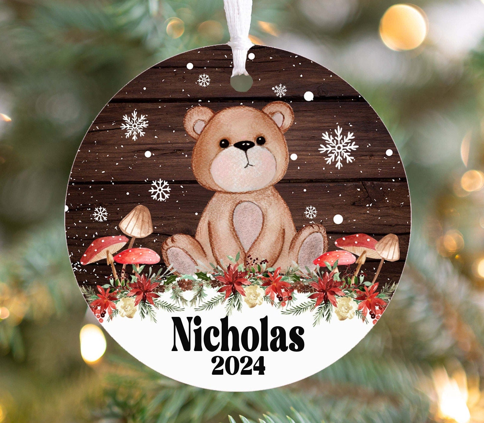 Personalized Bear Christmas Ornament 2025 – Woodland Animal Ornament with Mushrooms & Wood Background