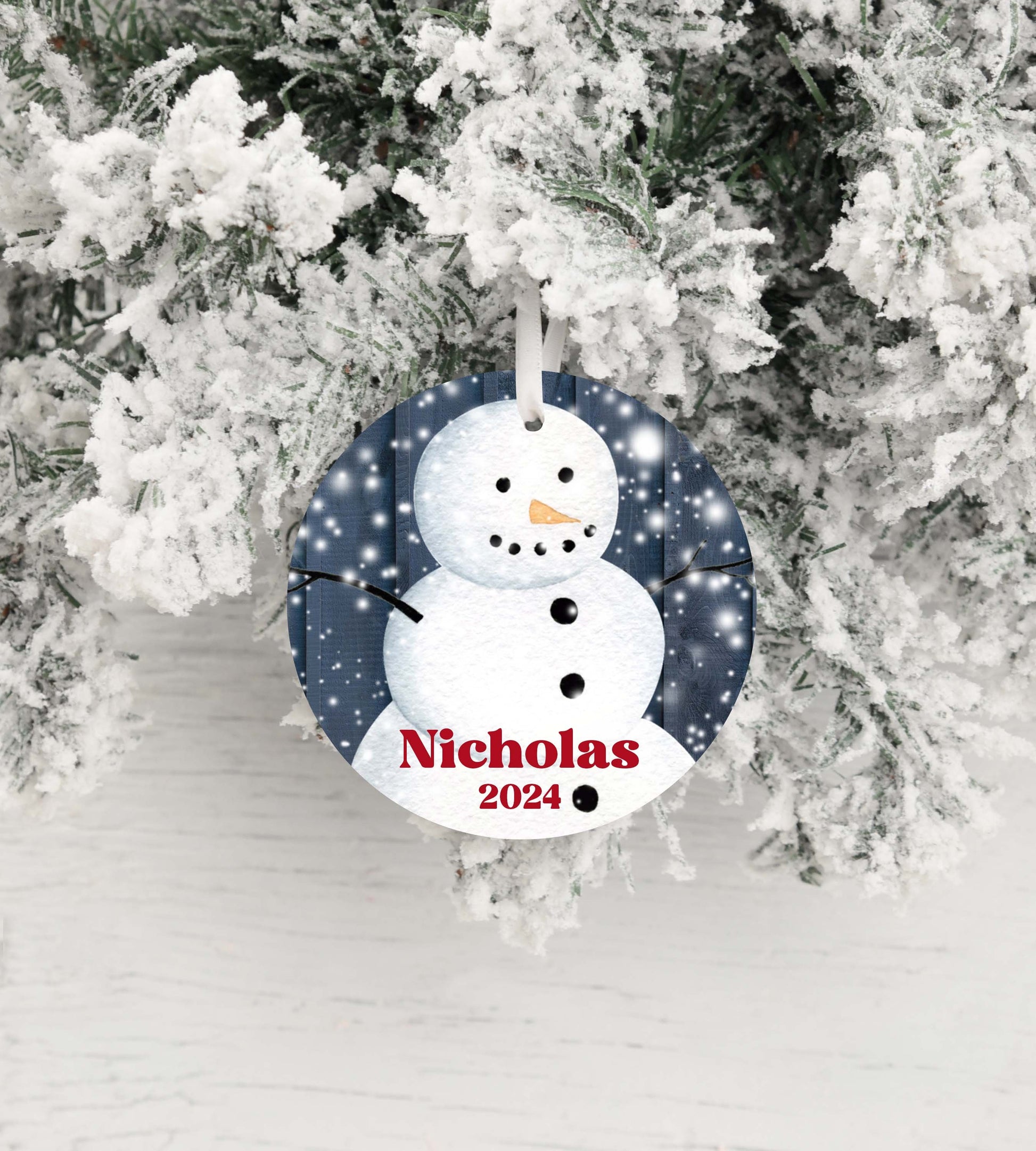 Featuring a vibrant blue background and a happy snowman design, this ornament is personalized with your chosen name and year, creating a keepsake to treasure for years. The reverse side is white for a clean, polished look.