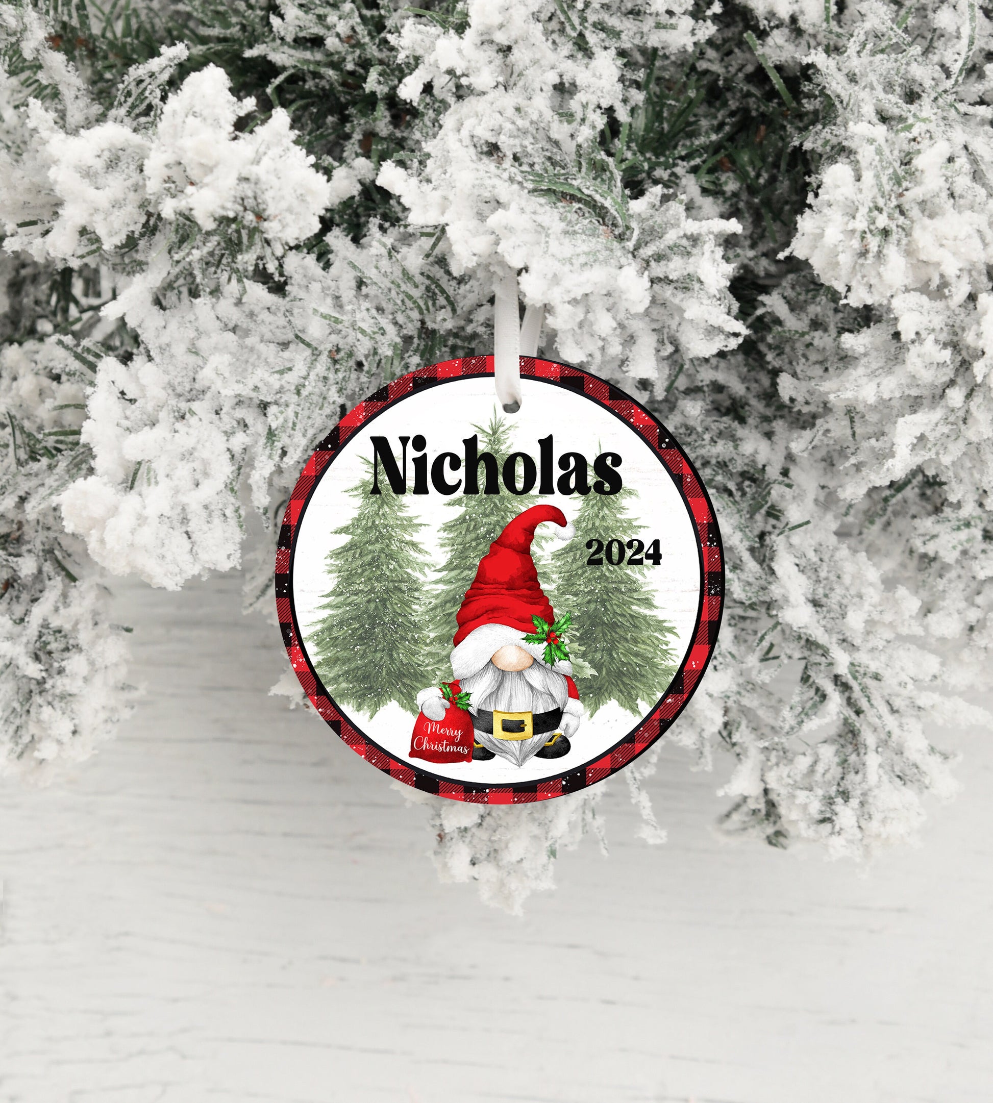 Featuring a cheerful gnome on a white background with a festive Christmas border, this ornament is personalized with your chosen name and year. Each ornament measures 3.5 inches round and is available in hardboard or aluminum. The design is professionally heat-pressed, ensuring it won’t fade. A white ribbon is included for easy hanging.