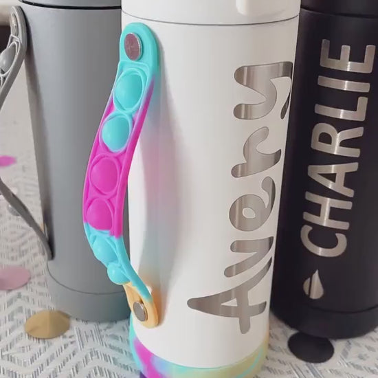 The bottle comes with a built-in straw, extra straws, and a pop-it handle—perfect for kids, teens, and tweens who love a fun fidget or need stress relief. Personalization is laser engraved (not a sticker) so your child’s name or favorite design lasts.