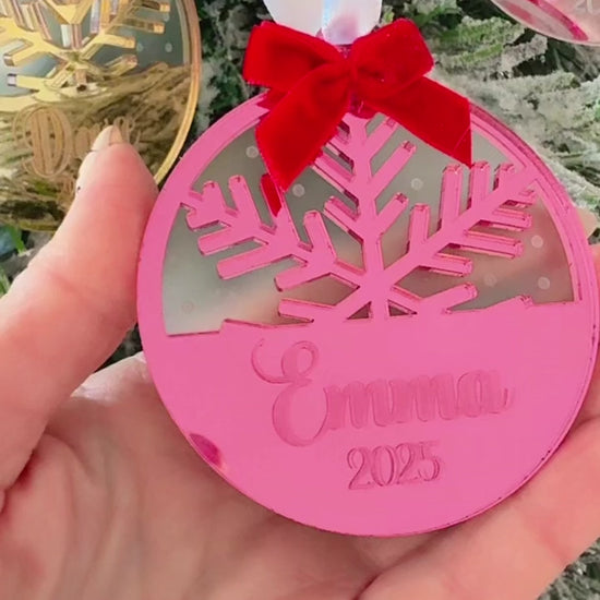 Add a touch of shimmer and personalization to your tree this year with our custom mirror acrylic snowflake ornament. Each ornament is laser engraved with any name and features a festive red bow, white satin ribbon and comes in its own gift box. It's Ready to hand or gift.