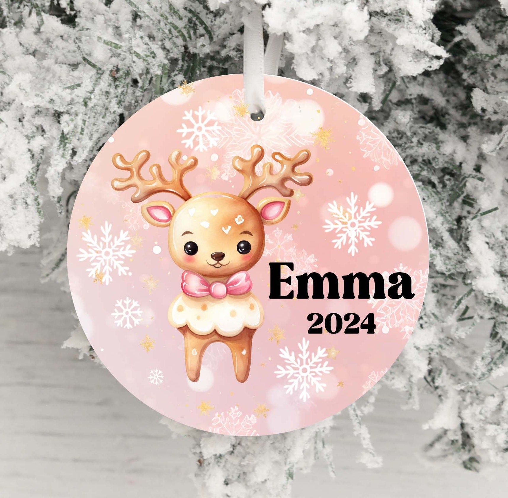 Personalized Pink Reindeer Christmas Ornament- Custom Name & Year | Aluminum or Hardboard