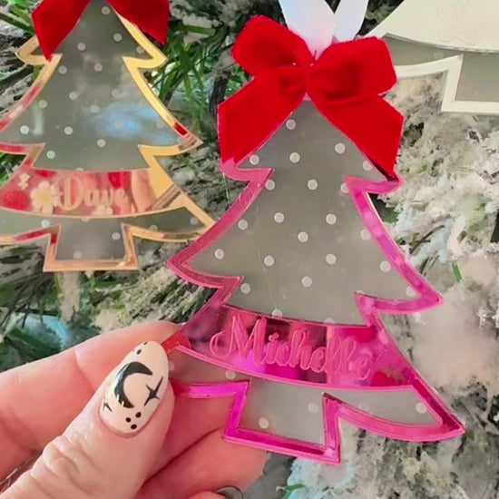 Add a touch of shimmer and personalization to your tree this year with our custom mirror acrylic Christmas tree ornament. Each ornament is laser engraved with any name and features a festive red bow, white satin ribbon and comes in it's own gift box. It's Ready to hand or gift.