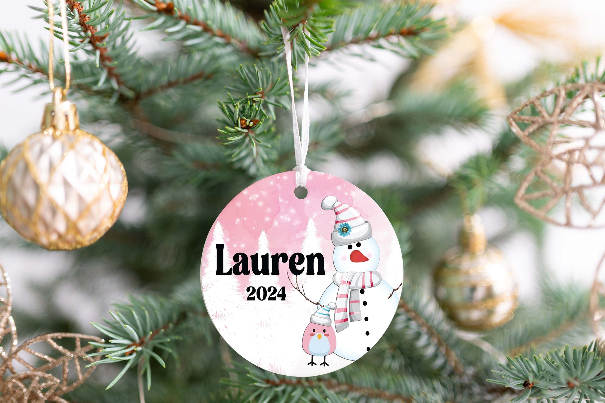 Personalized Pink Snowman Christmas Ornament- Custom Name & Year | Aluminum or Hardboard