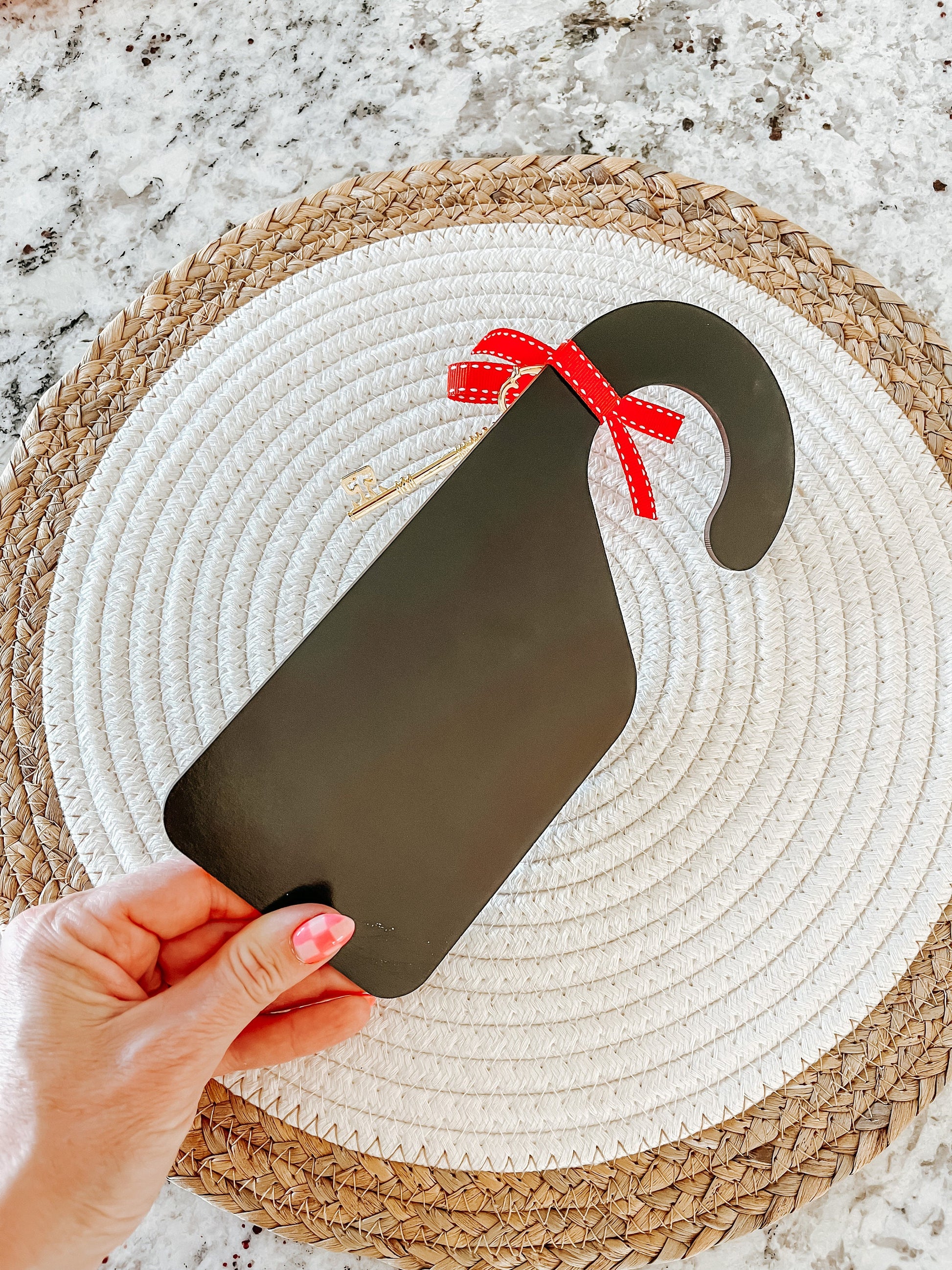 Each door hanger is crafted from white MDF hardboard and laser engraved with your custom personalization, so Santa knows exactly who left the key for him. A gold plastic key and festive red ribbon complete this charming holiday decoration.