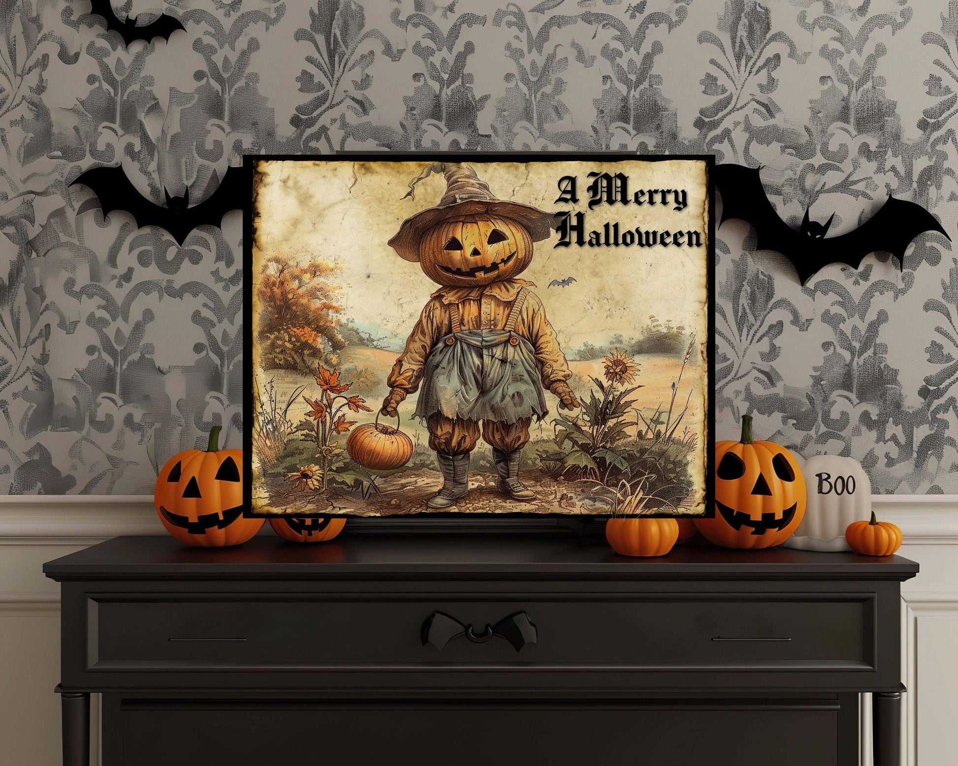 Add a touch of spooky charm to your home this Halloween with our primitive Pumpkin Head Scarecrow metal sign. Featuring a whimsical pumpkin scarecrow surrounded by pumpkins, this glossy aluminum wall art is perfect for mantles, shelves, entryways, porches, or outdoor displays.